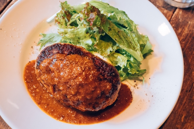 ハンバーグと野菜のサラダ、ご飯、スープなどをセットにしたランチです。ライスはお好みにより玄米を選ぶこともできます。